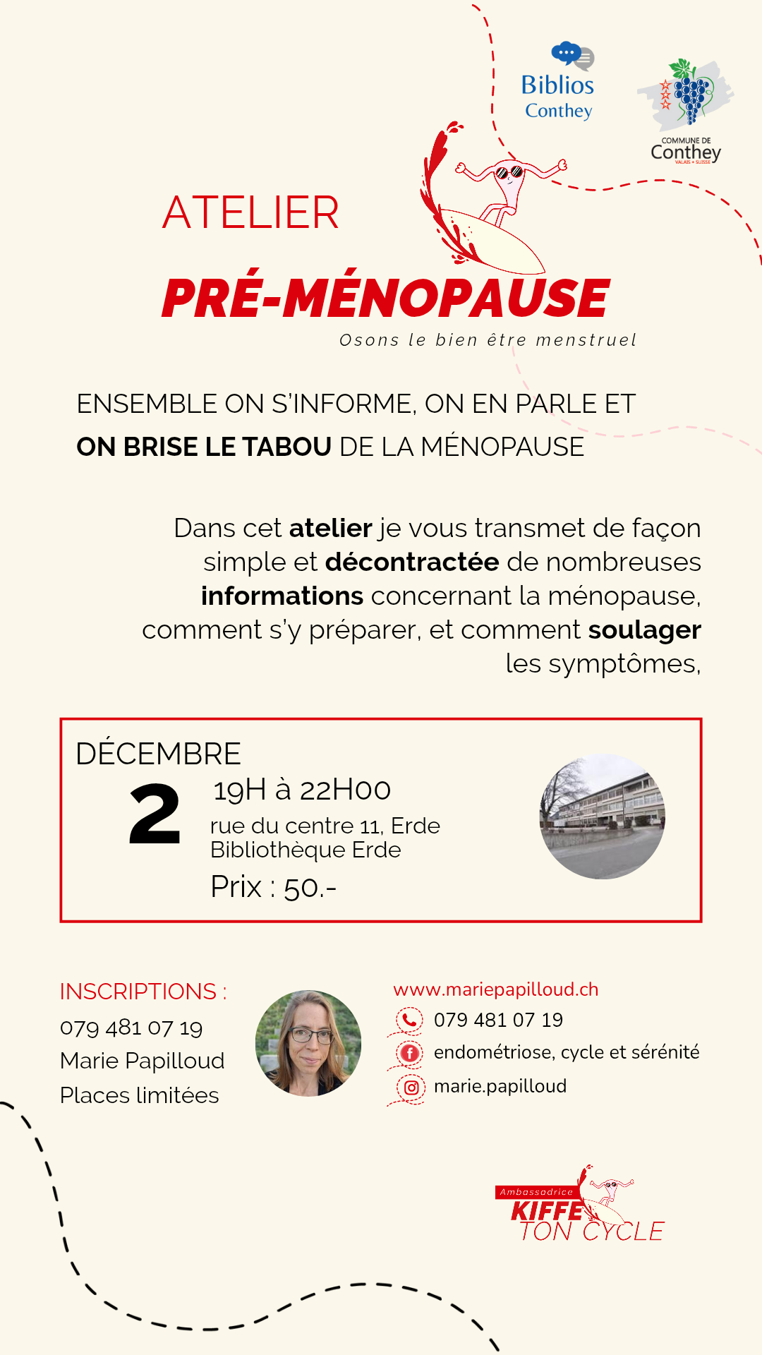 La Bibliothèque de Conthey (Erde-Plan-Conthey) en collaboration avec Marie Papilloud vous propose 2 soirées pour échanger autour de la pré-ménopause.